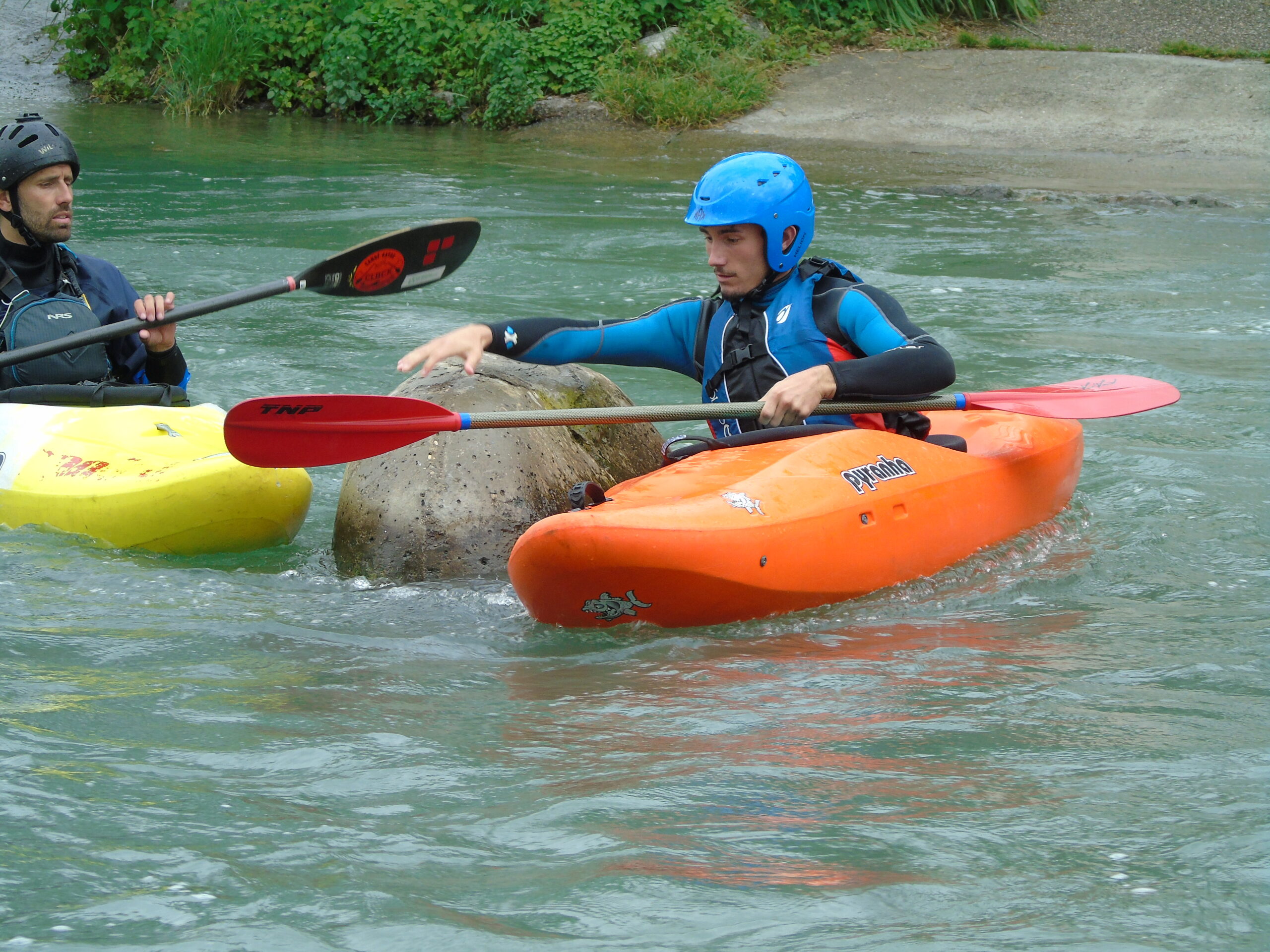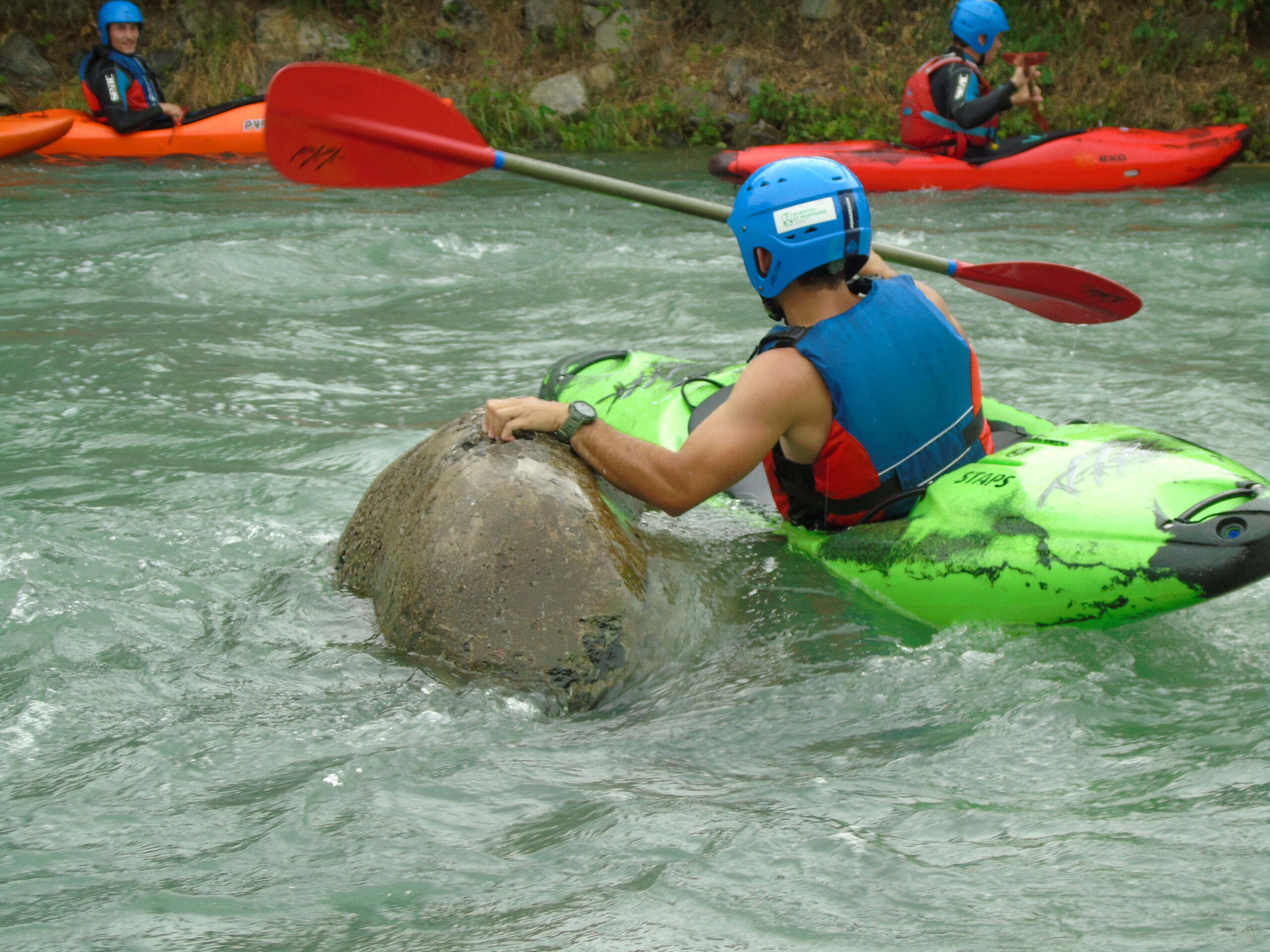 - décomplexifier la situation en choississant une zone plus calme. Le moniteur peut se placer juste derrière le rocher pour rassurer le kayakiste.